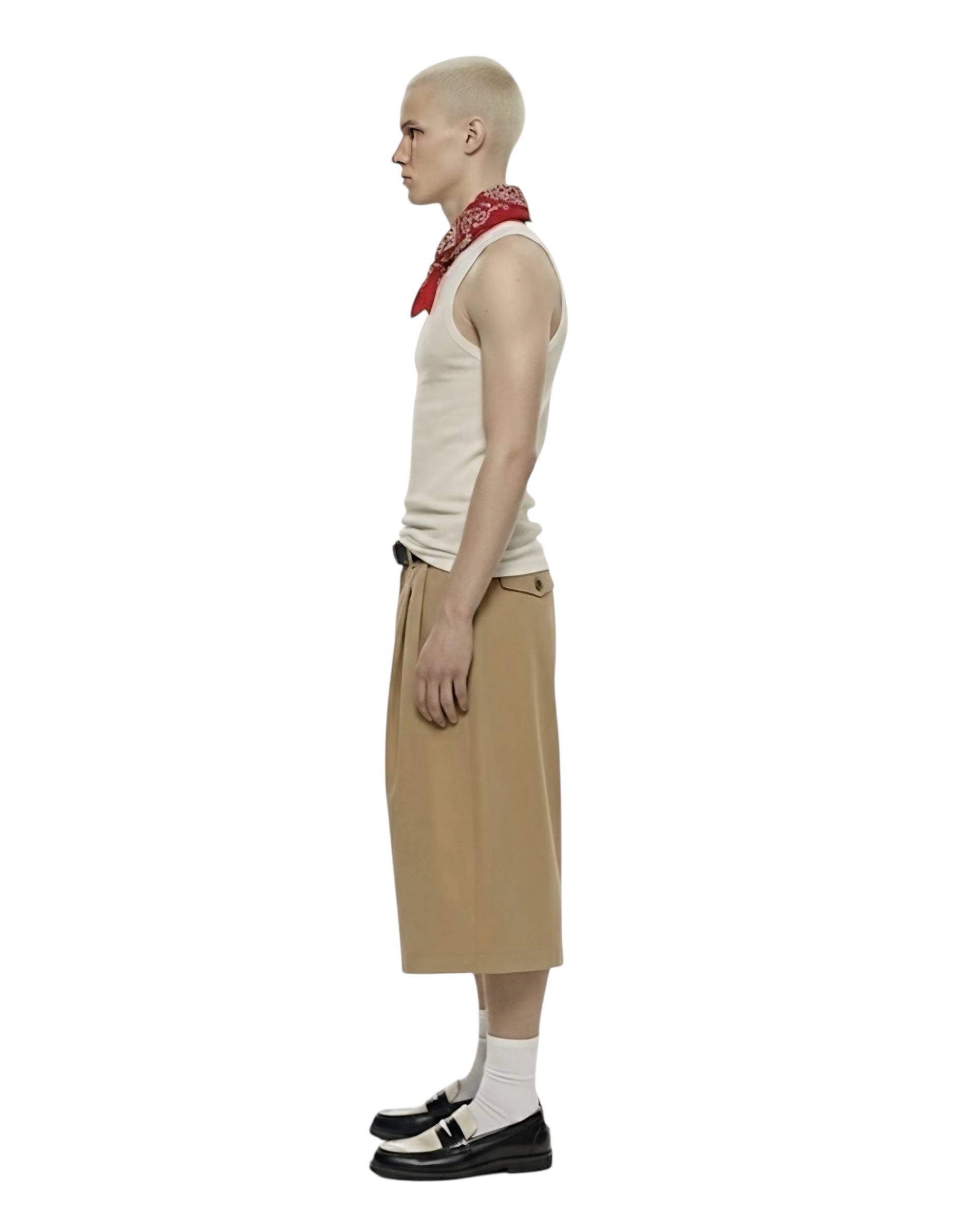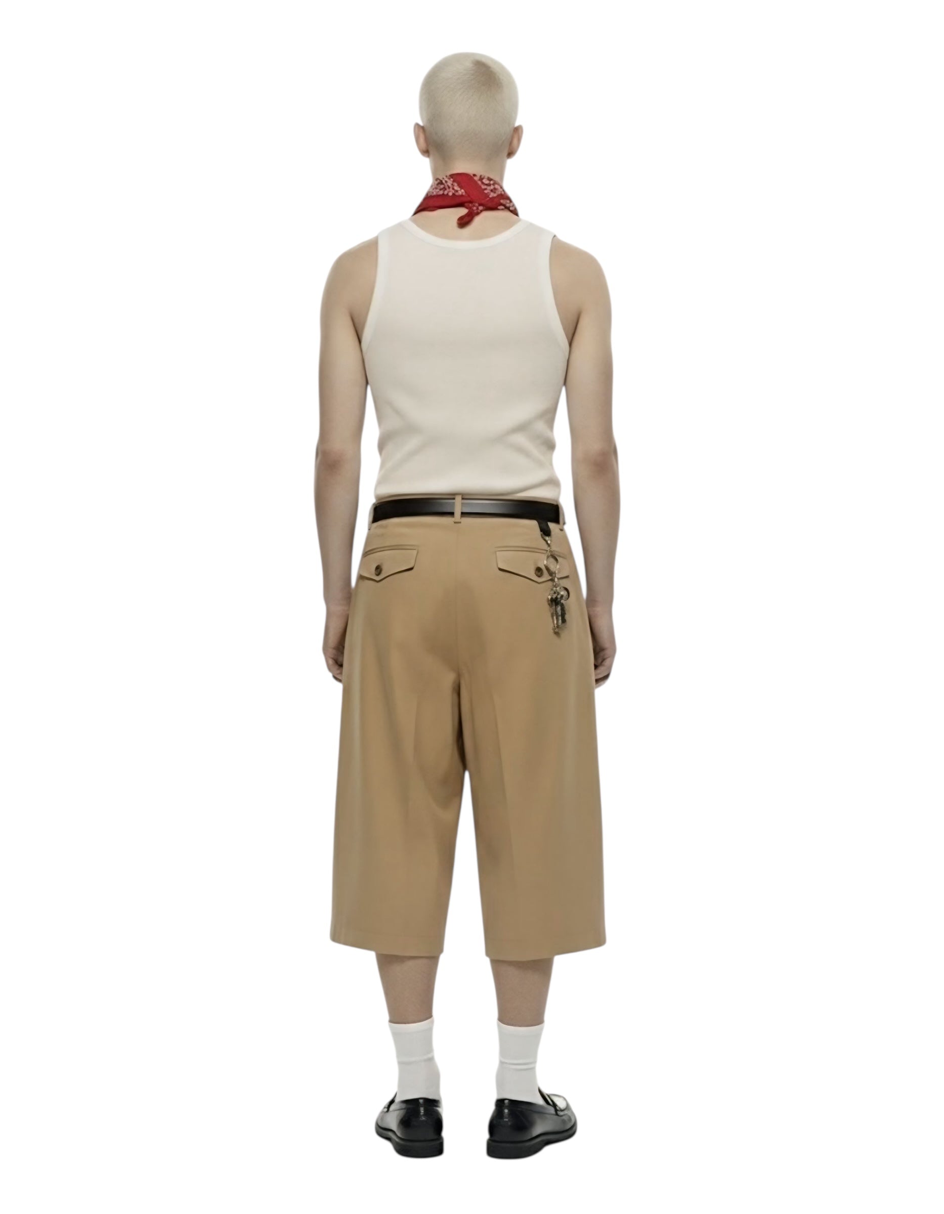 Bridging the gap between formal tailoring and streetwear silhouettes. The Pleated Trouser Short is cut from a high-density cotton twill that provides a crisp, structured drape. Featuring a single deep front pleat to add volume to the thigh, this piece creates a sophisticated wide-leg profile that hits just below the knee. Finished with traditional belt loops and a concealed zip fly. The ultimate versatile staple for elevated summer styling.