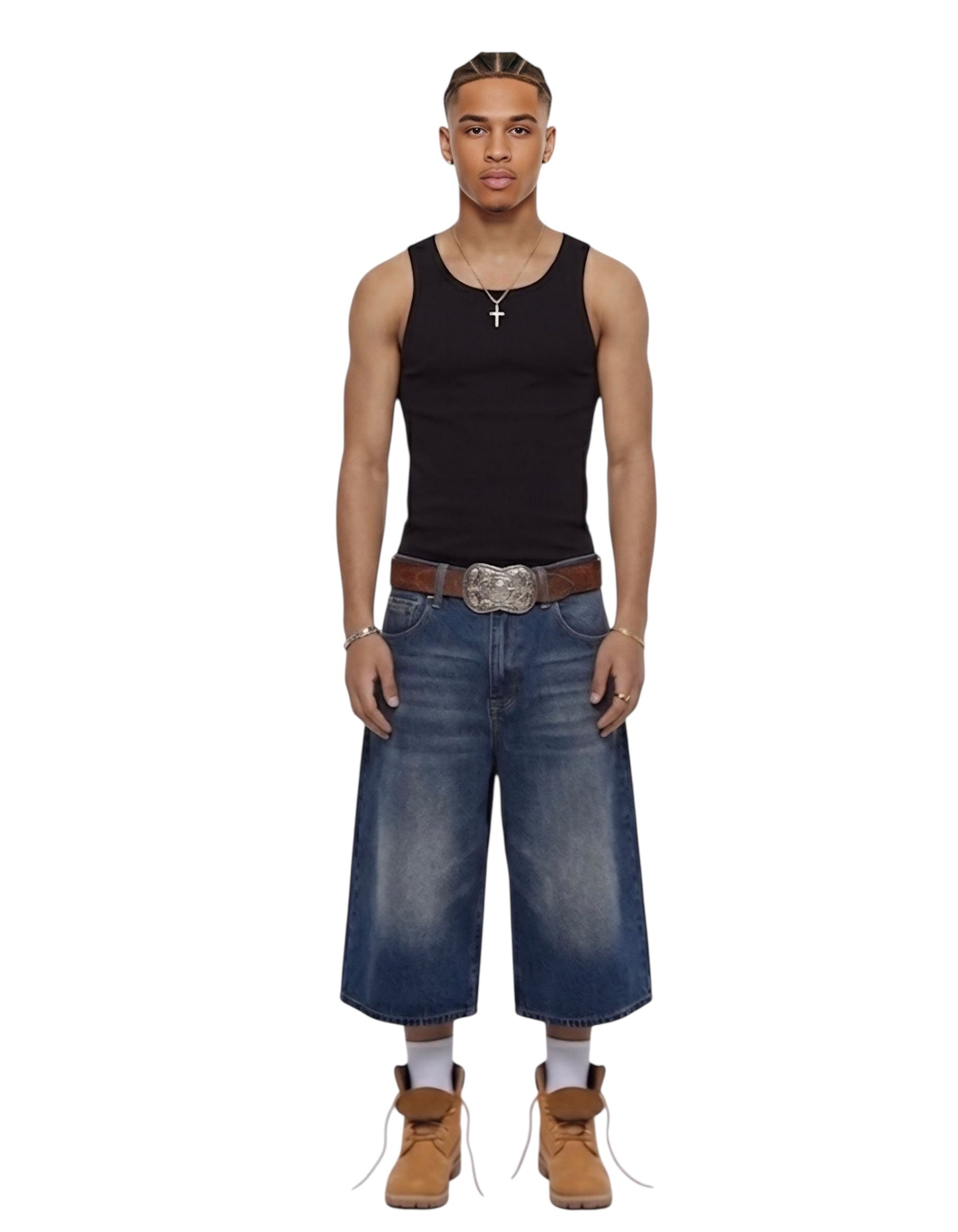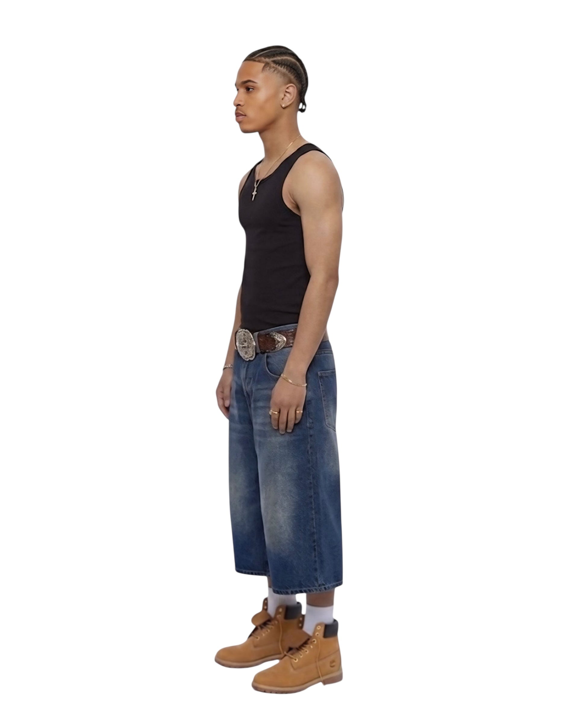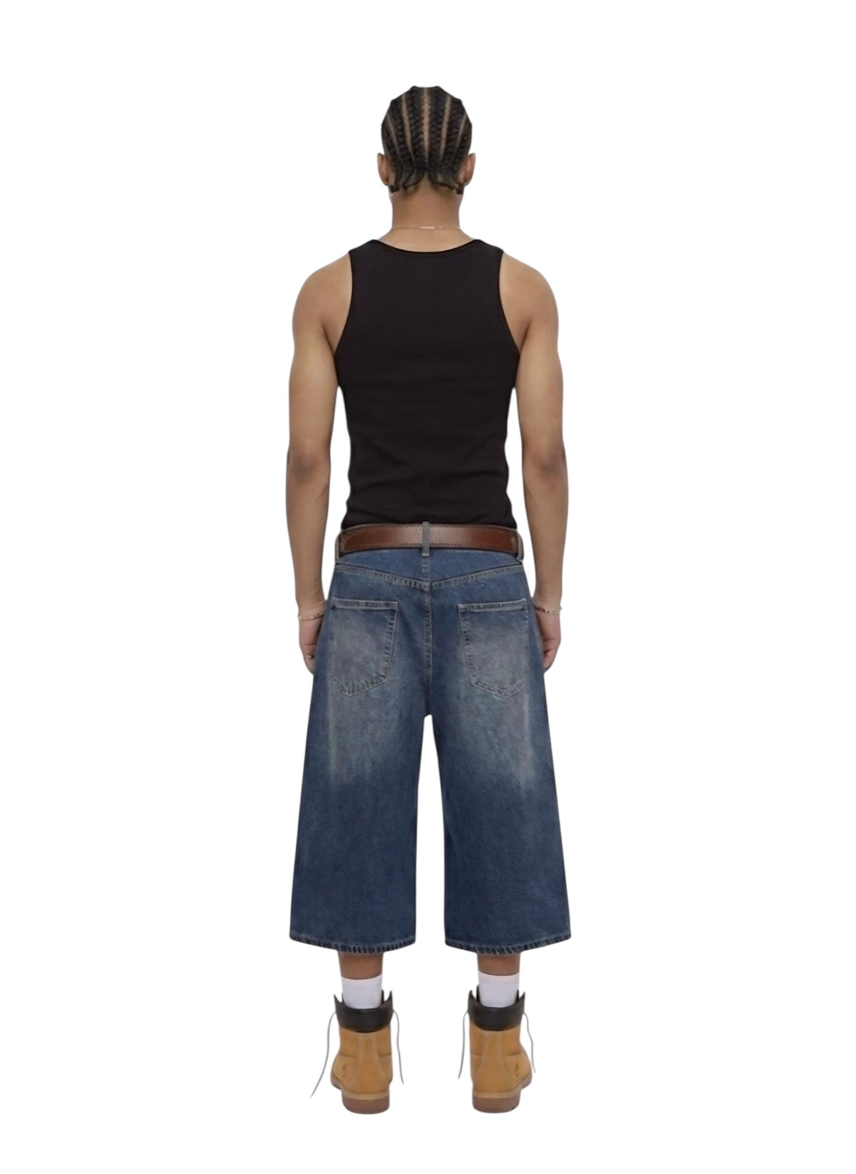 The definitive summer silhouette. Reimagining the oversized aesthetic of 90s skate culture, our Wide Leg Denim Short is cut from rigid heavyweight denim to maintain a voluminous structure. The fit is intentionally exaggerated, sitting low on the waist and hitting well below the knee for a directional, baggy profile. Finished with a vintage tint wash and branded hardware. The perfect balance of nostalgia and modern luxury.